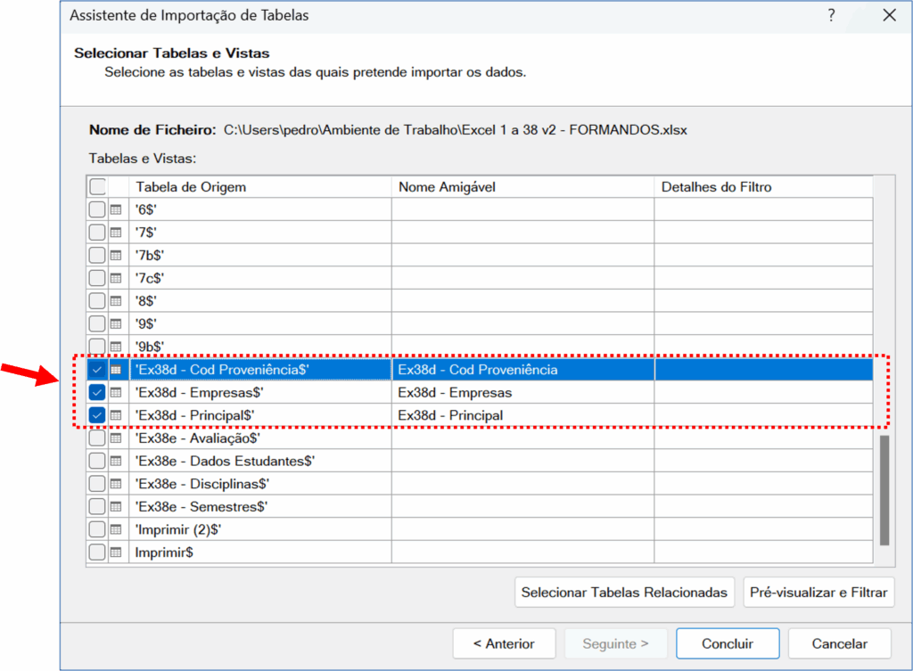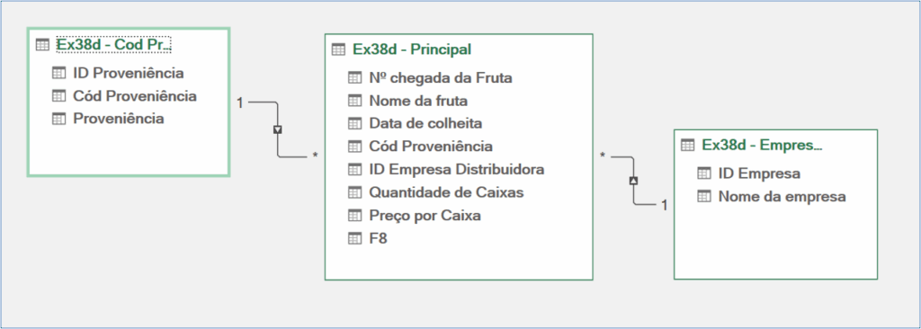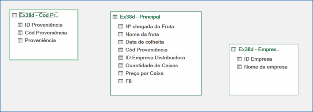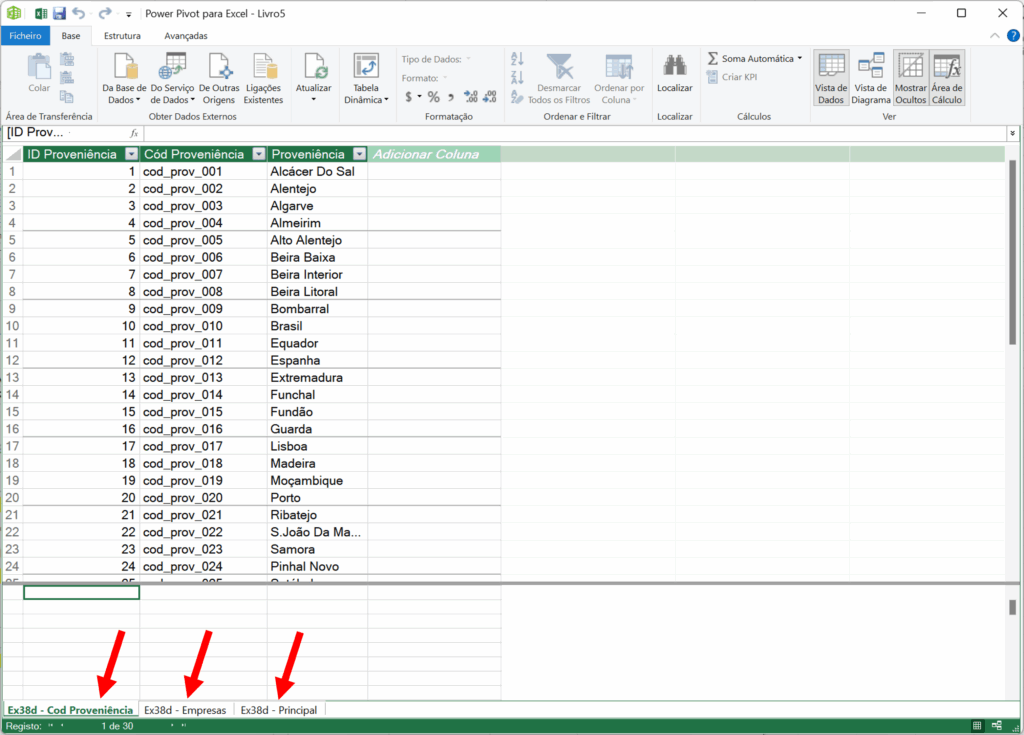 Para este exemplo usei 3 folhas existentes num livro, com os nomes: “Ex38d – Cod Proveniência”, “Ex38d – Empresas” e “Ex38 – Principal”.