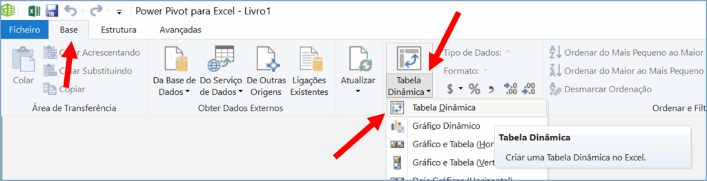 13. Agora, no separador Base, clique em Tabela Dinâmica, seguido de Tabela Dinâmica