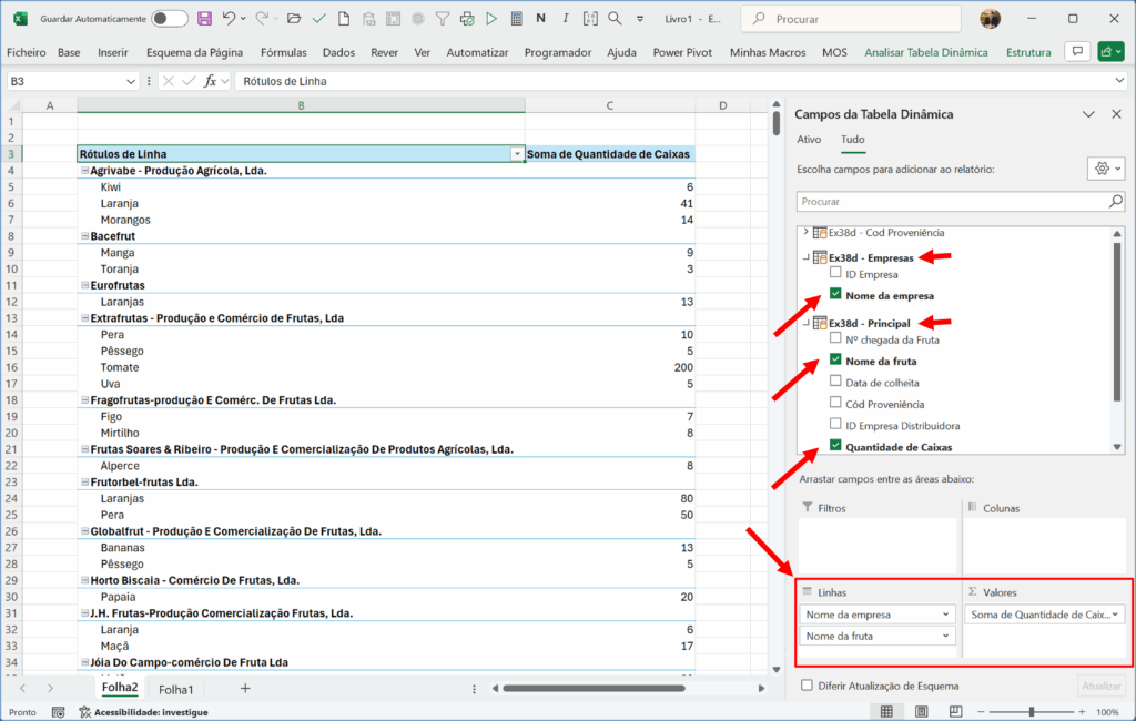 No seguinte exemplo é mostrada a fruta, e as respetivas quantidades de caixas, por cada Empresa (o seu nome).