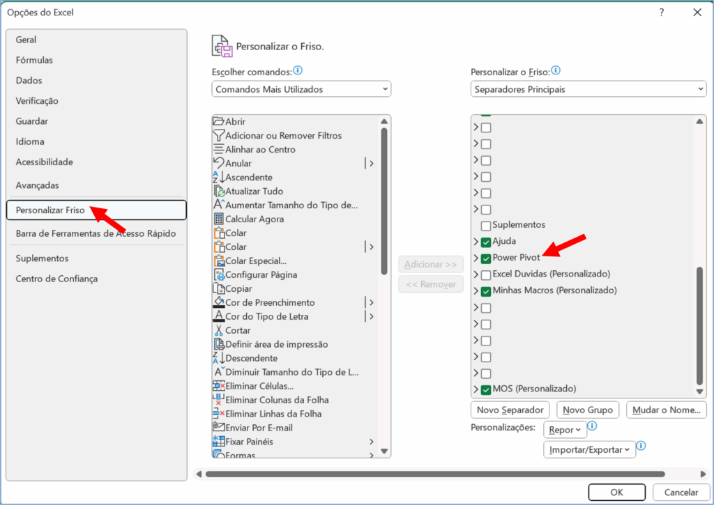 Caso não tenha o referido separador, aceda ao separador Ficheiro | Opções | Personalizar Friso | ativando a opção Power Pivot
