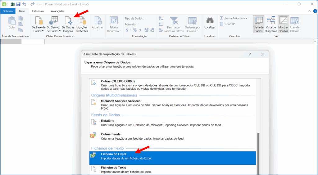 4. Já dentro do Power Pivot, aceda ao separador Base | De Outra Origens, escolhendo em seguida Ficheiro de Excel