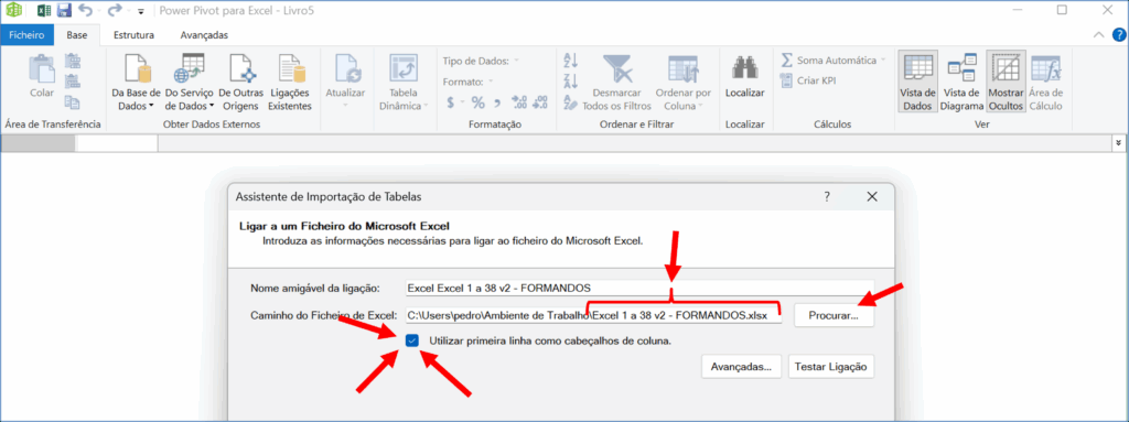Importante: ative a opção “Utilizar primeira linha como cabeçalho de coluna”, para que os títulos das colunas das tabelas com a informação, não fiquem como registos normais