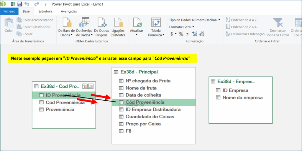 No seguinte exemplo é possível ver que o campo ID_Proveniência está a ser arrastado para o campo Cód. Proveniência